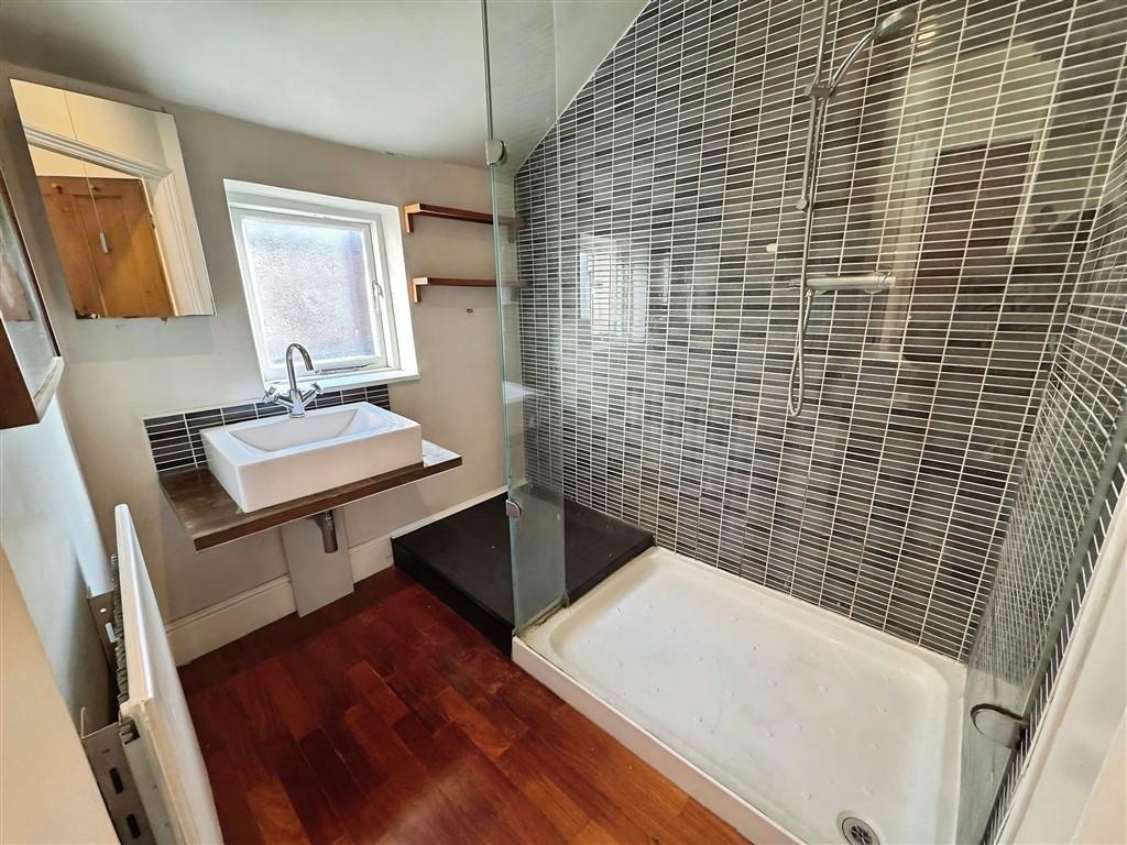 Shower room - Side elevation window. Large tiled shower enclosure. Counter top wash hand basin. Radiator. Laminate flooring.