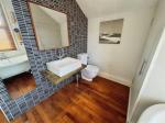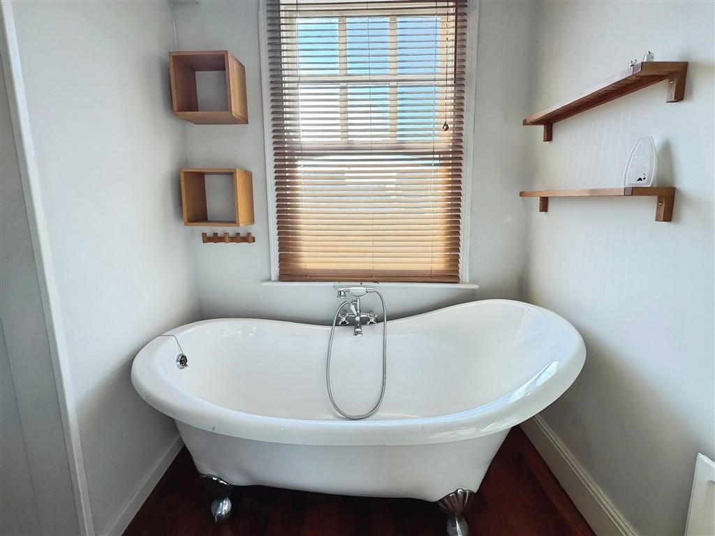 Bathroom - Rear elevation window. Laminate floor. Free standing bath. Counter top wash hand basin. Low flush W.C. Radiator. Boiler cupboard. Spot lights.