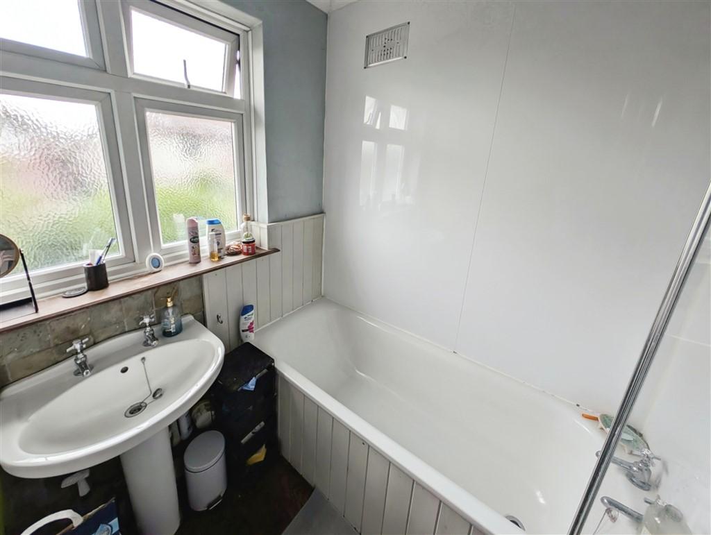 Bathroom - Bath with electric shower and wash hand basin. Frosted uPVC double glazed window, part tiled walls, vinyl flooring, wall mounted radiator, coving to ceiling and ceiling light.