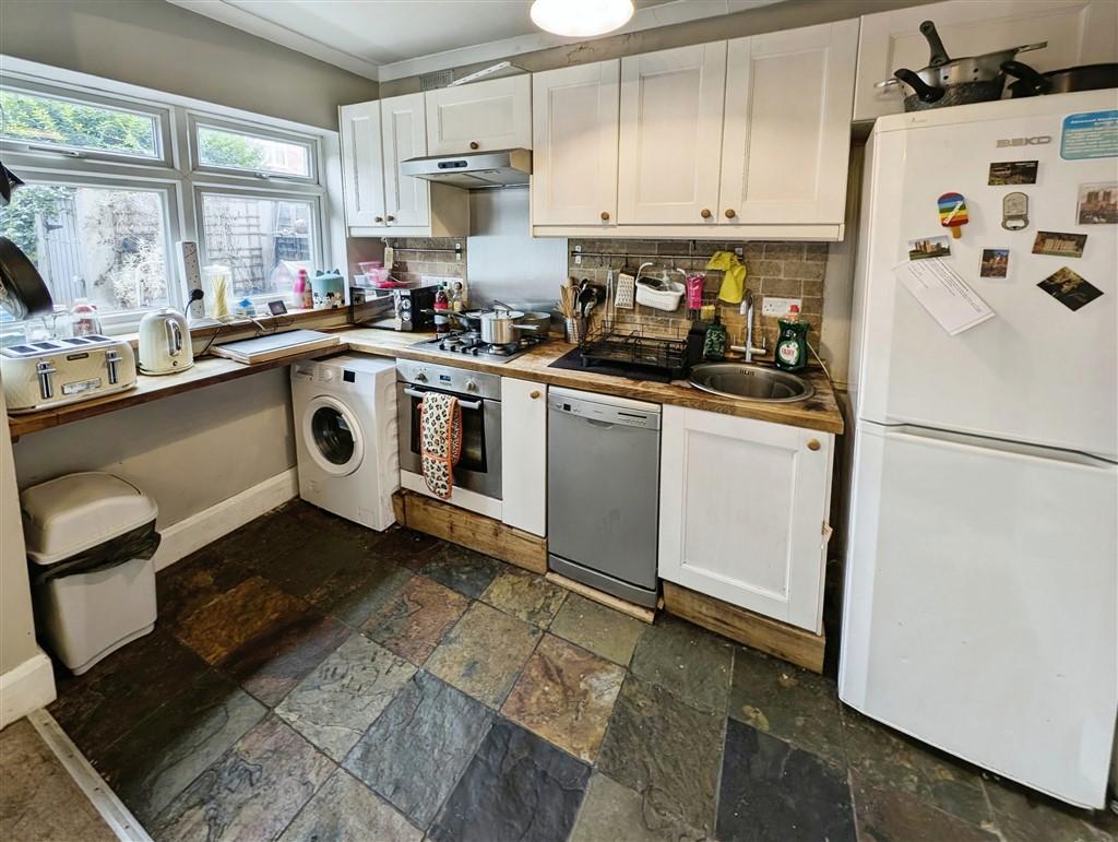 Kitchen - 10' 2'' x 5' 6'' (3.12m x 1.7m) Fitted wall, base and drawer units, oval sink unit with mixer tap, integrated oven, hob, overhead extractor fan, plumbing for washing machine and space for fridge/freezer. UPVC double glazed window to rear aspect, tiled flooring, splash back tiles, coving to ceiling and ceiling light.