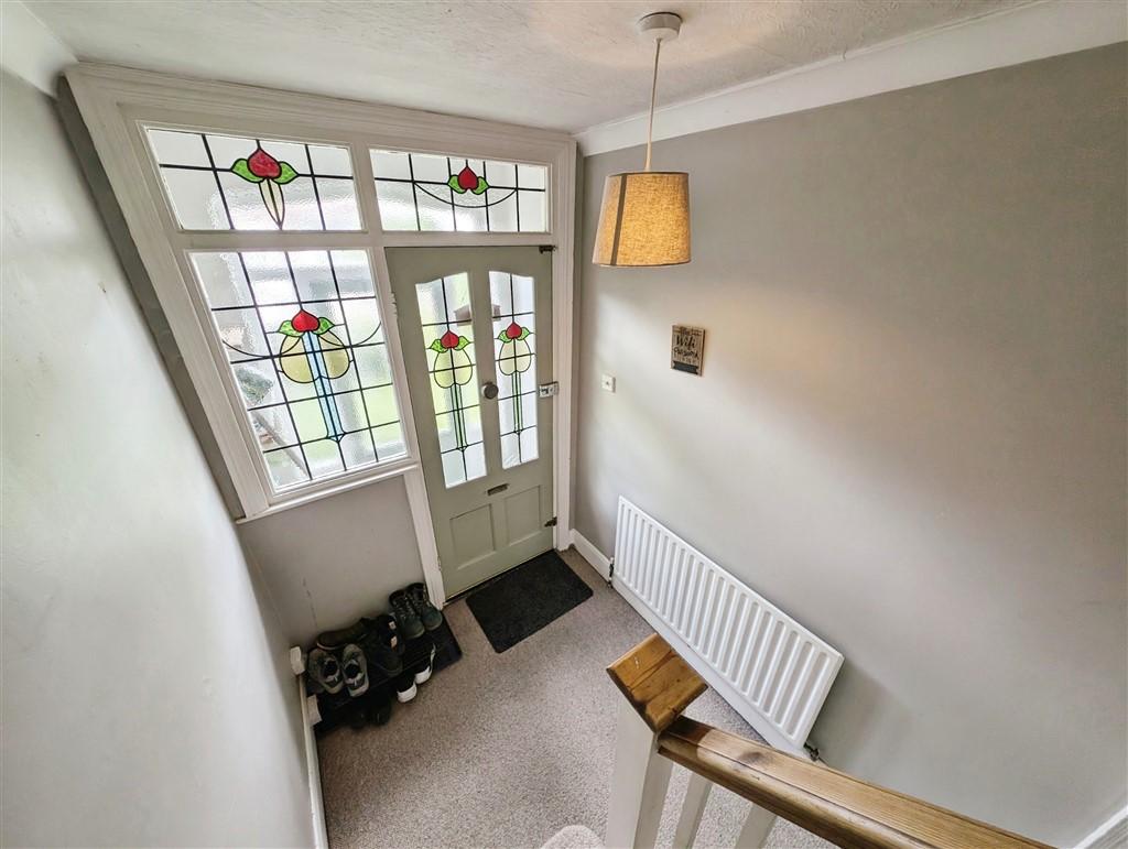 Hallway - Front door, stained glass windows, stairs to landing, carpeted flooring, wall mounted radiator, under stairs storage, coving to ceiling and ceiling light.