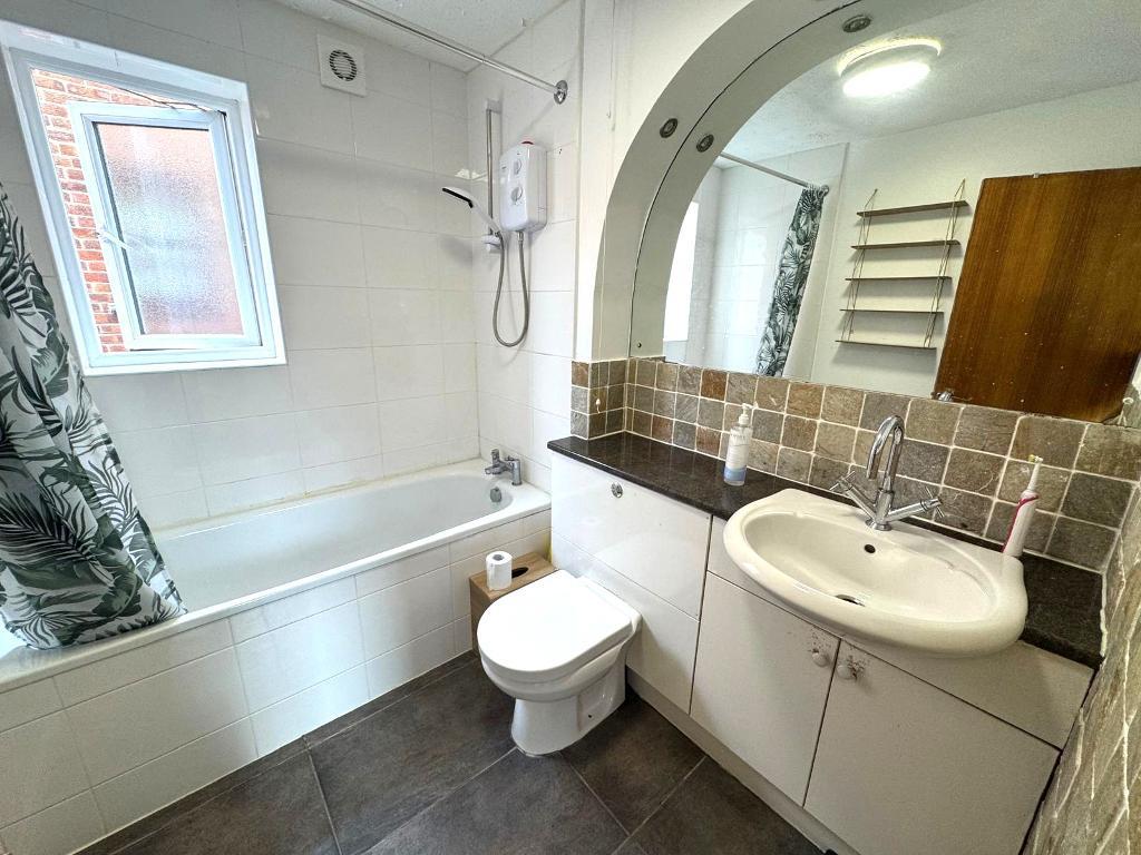 Bathroom - Bathtub, WC, wash hand basin, tiled flooring, electric shower, side elevation window, radiator, lighting, shaver point.