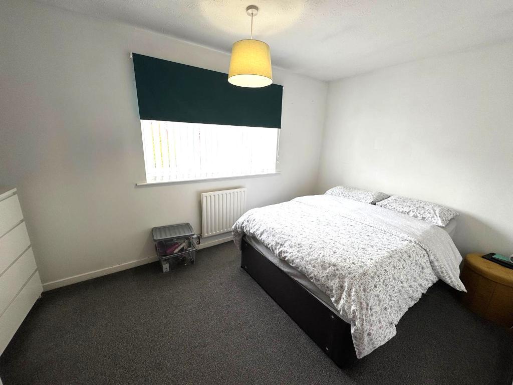 Bedroom One - Rear elevation window, carpeted flooring, light pendant, radiator.
