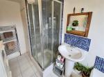 Bathroom - 9' 10'' x 5' 6'' (3m x 1.7m) White bathroom suite that includes panelled bath with mixer tap, low level WC, wash hand basin and separate shower cubicle. Frosted uPVC double glazed window, part tiled walls, tiled flooring, ceiling light and storage cupboard housing the combination boiler.