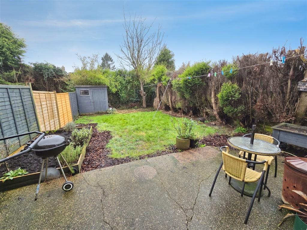 Attractive and private rear garden, thoughtfully arranged for both relaxation and outdoor entertaining. A generous paved patio provides ideal space for seating and a BBQ area, while the lawn is bordered by mature shrubs, fencing and trees. Additional features include a vegetable planter and a handy garden shed for storage.