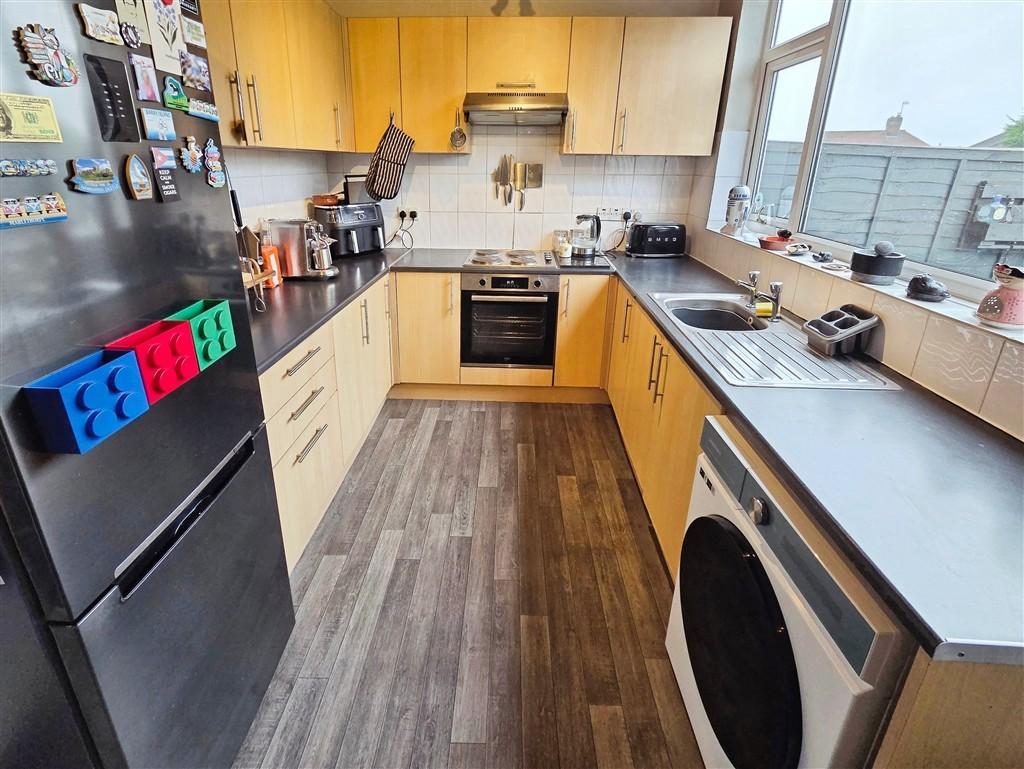 UPVC double-glazed window overlooking the rear garden and part double-glazed door providing direct garden access. Finished with vinyl flooring, part-tiled walls, wall-mounted radiator, boiler, useful understairs storage and ceiling light.