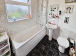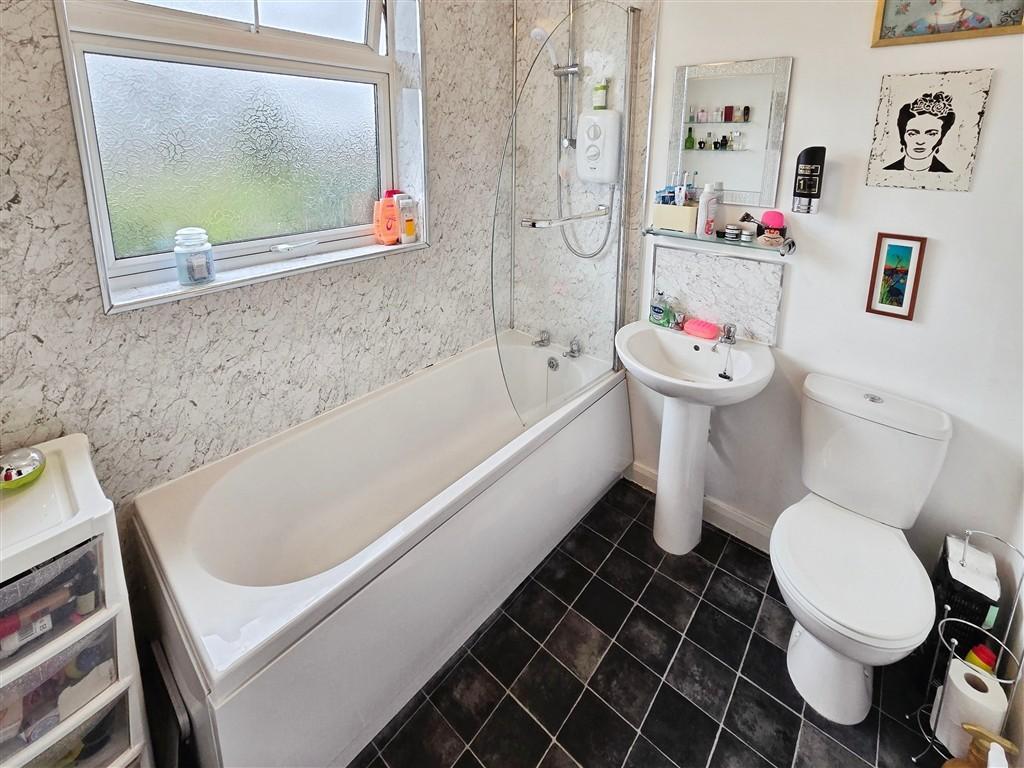 Bathroom - 6' 10'' x 6' 2'' (2.1m x 1.9m) Family bathroom comprising a panelled bath with electric shower over, low-level WC and wash hand basin. Finished with part-tiled walls, vinyl flooring, frosted uPVC double-glazed window and ceiling light.
