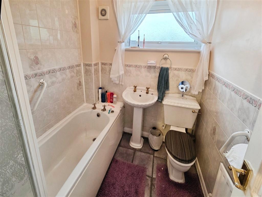 Bathroom - 6' 2'' x 5' 10'' (1.9m x 1.8m) Fitted with a panelled bath with electric shower over, low-level WC and wash hand basin. Features include a frosted uPVC double glazed window, part tiled walls, vinyl flooring, wall-mounted radiator, coving and ceiling light.