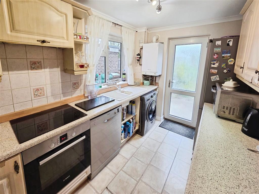 Kitchen - 10' 5'' x 7' 2'' (3.2m x 2.2m) Fitted with a range of wall, base and drawer units, complemented by a one-and-a-half bowl sink with mixer tap. Integrated oven, hob and overhead extractor fan. Plumbing for a washing machine and dishwasher, plus space for a fridge/freezer. A uPVC double glazed window to the side and a part-glazed door provide access to the garden. Finished with vinyl flooring, tiled splashbacks, combination boiler, coving and ceiling light.